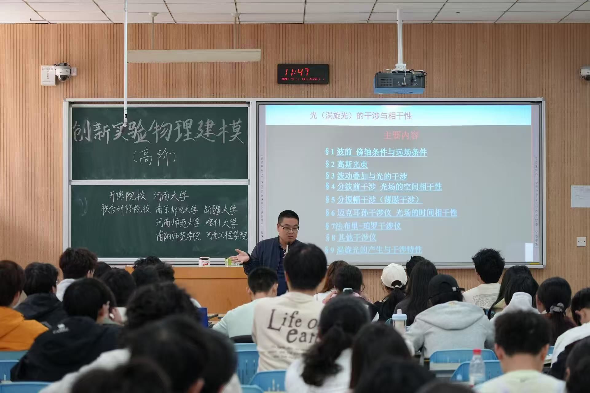 课堂内容紧凑、亮点纷呈。在专业授课环节,李鹏老师以“光的干涉与相关性”为主题切入,系统讲解了波动叠加与干涉原理,并重点剖析了涡旋光的产生机制与干涉特性,为同学们提供了扎实的理论支撑与清晰的研究指导。